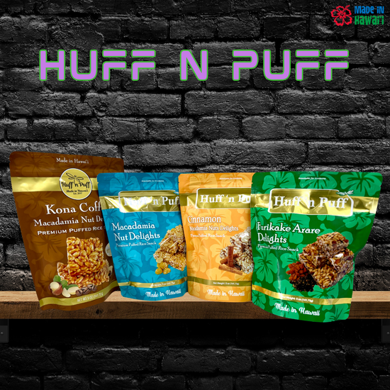 SHOP NOWHuff n Puff — the perfect mix of crispy puffed rice and buttery Hawaiian macadamia nuts, available in four irresistible flavors (Mac Nut, Furikake Arare, Kona Coffee, & Cinnamon.